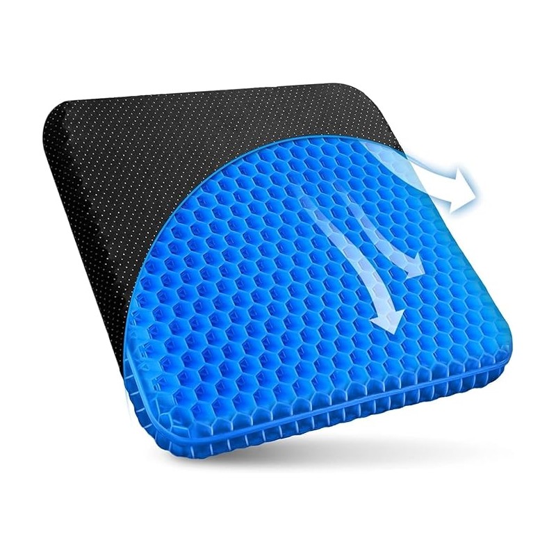 Nuestros cojines están diseñados para absorber los puntos de presión, aliviar el dolor del nervio ciático, el cóccix, la cadera y los glúteos, el dolor del cóccix y brindar una comodidad máxima sin precedentes para la columna vertebral. Cojín diseñado para dar soporte en la zona de los glúteos y espalda Está cansado y le duele la espalda? ¿Se pasa gran parte del día sentado y ya no sabe cómo colocarse en la silla? ¿Tiene molestias en los lumbares y en los glúteos? El secreto es su diseño en forma de panal de abeja que le proporciona una asistencia lumbar óptima. La diferencia respecto a otros cojines posturales es que está compuesto con elasticore 100%. Este material minimiza los puntos de presión y es súper flexible y resistente. Otros cojines crean un espacio especial para el coxis, sin embargo, se adapta perfectamente a la forma de su cuerpo. No se deforma, ya que si se levanta recupera siempre su forma original. Reduzca el estrés y manténgase cómodo: este cojín de silla de gel se ajustará perfectamente a la curva de su cadera, suave y sin perder apoyo, brindando comodidad al reducir la presión en la parte inferior de la espalda, cintura, glúteos y muslos, y mantener una postura saludable. Los cojin gel son ligeros y fáciles de transportar, puede llevarlos a su casa, oficina, silla de ruedas y cine. Este cojín para coxis y ciatica puede reducir la presión sobre el coxis. Se puede usar en varios lugares, como: cojín para silla de oficina, cojín para automóvil, cojín para silla de ruedas, Llévelo a eventos deportivos y úselo en bancos y gradas.