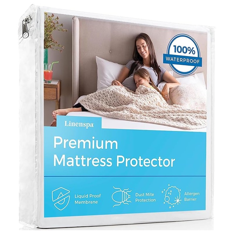 IMPERMEABLE - La capa superior suave, silenciosa y 100 % impermeable repela todos los líquidos, además de fluidos corporales, transpiración o derrames accidentales. ADIÓS ALERGIAS - Tejido hipoalergénico ultradelgado con reverso de poliuretano silencioso que bloquea los ácaros y alérgenos: materiales sin vinilo seguros para toda la familia. SUAVE Y SEGURO - El protector estilo sábana ofrece bolsas profundas para un ajuste suave y seguro, en colchones de hasta 36 cm de profundidad. El diseño se pensó para usarse con una sábana colocada sobre el protector para mantener la sensación de tu colchón. LAVABLE A MÁQUINA - Este protector impermeable puede lavarse y secarse a máquina a baja temperatura. Las instrucciones de cuidado son fáciles de seguir y te ayudarán a alargar la vida de tu protector. CALIDAD DURADERA - El protector de tamaño Queen mide 152 x 203 cm y tiene una generosa garantía de 10 años.